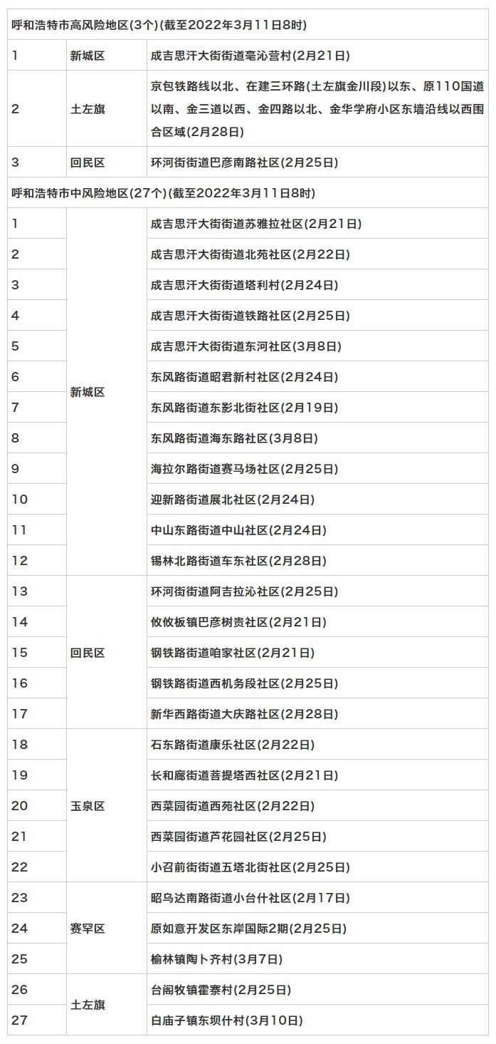 按照國(guó)務(wù)院聯(lián)防聯(lián)控機(jī)制《關(guān)于調(diào)整新冠肺炎疫情分區(qū)分級(jí)標(biāo)準(zhǔn)實(shí)施精準(zhǔn)管控措施的通知》規(guī)定,經(jīng)專(zhuān)家組評(píng)估,市指揮部研究決定,決定于3月11日8時(shí)起,將新城區(qū)保和少鎮(zhèn)野馬圖村,回民區(qū)環(huán)河街街道太平街社區(qū),玉泉區(qū)長(zhǎng)和廊街道大召社區(qū)、小召前街街道建華北街社區(qū)調(diào)整為低風(fēng)險(xiǎn)地區(qū)。其他地區(qū)風(fēng)險(xiǎn)等級(jí)不變。