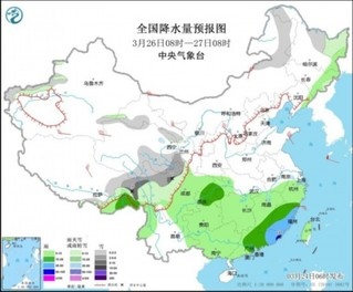 圖4 全國降水量預(yù)報(bào)圖(3月26日08時(shí)-27日08時(shí))