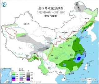 圖3 全國降水量預(yù)報(bào)圖(3月25日08時(shí)-26日08時(shí))