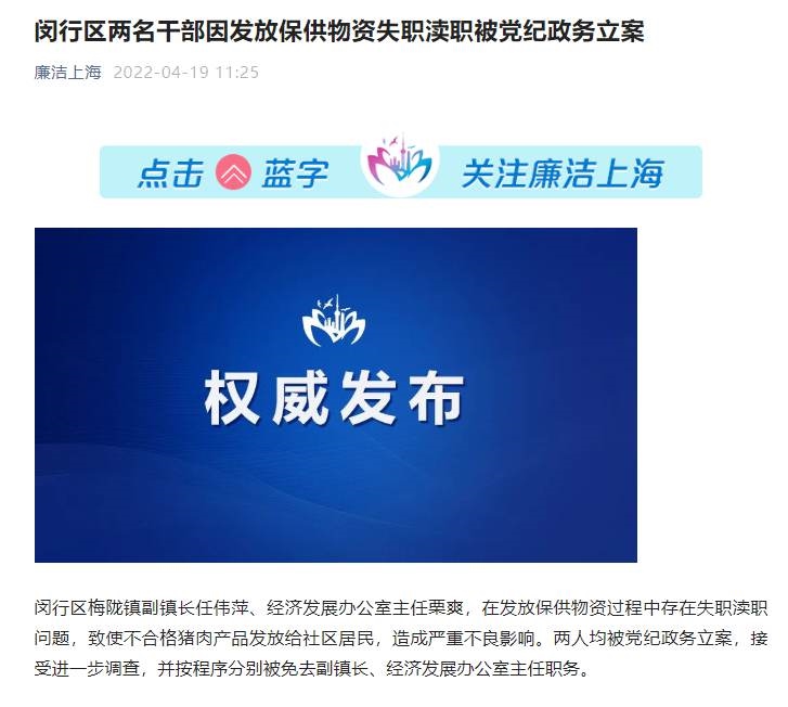 閔行區(qū)梅隴鎮(zhèn)副鎮(zhèn)長(zhǎng)任偉萍、經(jīng)濟(jì)發(fā)展辦公室主任栗爽,在發(fā)放保供物資過程中存在失職瀆職問題,致使不合格豬肉產(chǎn)品發(fā)放給社區(qū)居民,造成嚴(yán)重不良影響。兩人均被黨紀(jì)政務(wù)立案,接受進(jìn)一步調(diào)查,并按程序分別被免去副鎮(zhèn)長(zhǎng)、經(jīng)濟(jì)發(fā)展辦公室主任職務(wù)。