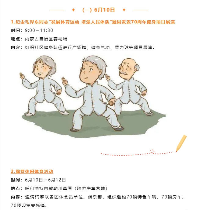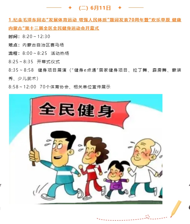 記者從自治區(qū)體育局獲悉,紀(jì)念毛澤東同志“發(fā)展體育運(yùn)動(dòng),增強(qiáng)人民體質(zhì)”題詞70周年暨“歡樂草原健康內(nèi)蒙古”第十三屆全區(qū)全民健身運(yùn)動(dòng)會(huì)將于6月10日至11日歡樂開啟。
