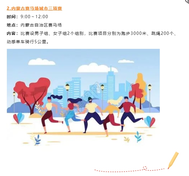 本次運(yùn)動(dòng)會(huì)認(rèn)真踐行“以人民為中心”辦賽理念,創(chuàng)新探索聚集少、規(guī)模小、符合大眾運(yùn)動(dòng)口味的內(nèi)蒙古賽馬場(chǎng)城市三項(xiàng)賽,包含跑步3000米、跳繩200個(gè)和動(dòng)感單車騎行5公里3個(gè)項(xiàng)目比賽。此外,還將舉辦公園系列挑戰(zhàn)賽、“跑遍青城”系列路跑活動(dòng)等,讓群眾在暢享運(yùn)動(dòng)的過程中盡情領(lǐng)略城市綠景的清新曼妙,進(jìn)一步推動(dòng)全民健身與全民健康深度融合。