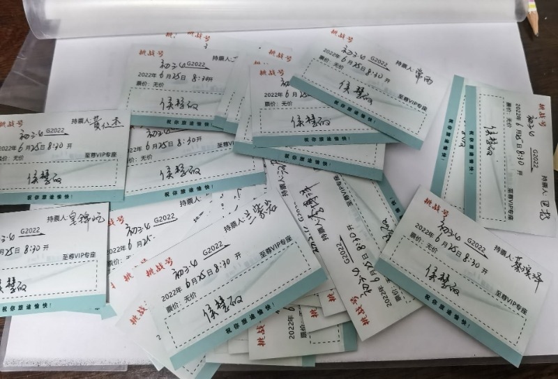 6月20日,呼和浩特市第五中學(xué)初三(4)班班主任侯慧敏老師給班里57名學(xué)生的手寫“告別信”刷屏朋友圈,紙短情長(zhǎng),愛意滿滿。每封信箋做成車票的樣式,正面寫著車次:“挑戰(zhàn)號(hào)”G2022;時(shí)間:2022年6月25日8時(shí)30分;座位:至尊VIP專座;票價(jià):無(wú)價(jià)。“終點(diǎn)站”并未填寫。侯慧敏說(shuō),那是孩子們的夢(mèng)想,需要靠他們自己來(lái)完成。當(dāng)天的畢業(yè)班會(huì)上,當(dāng)每個(gè)學(xué)生打開信箋,滿滿的回憶和濃濃的情誼不禁讓孩子們潸然淚下。