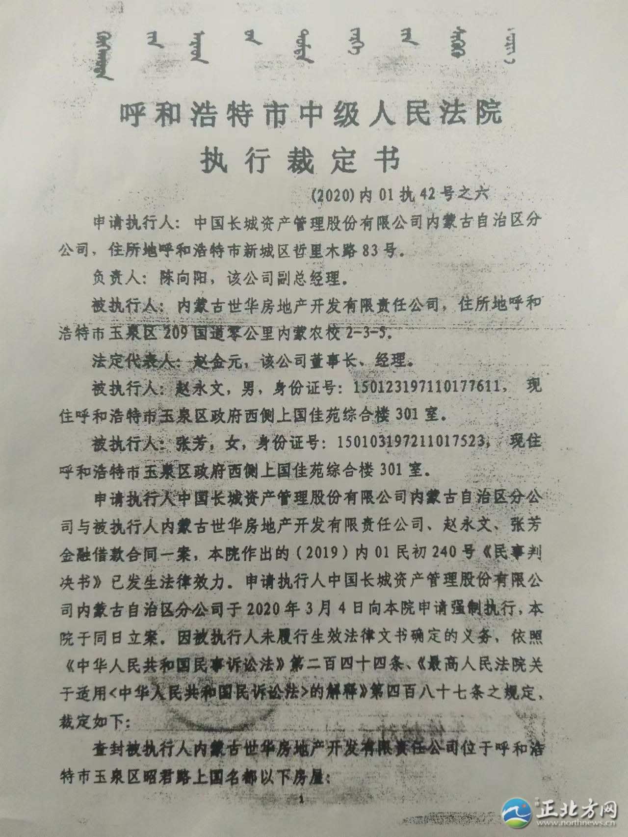記者從上國(guó)名都部分業(yè)主提供的法院執(zhí)行裁定書上了解到,僅中國(guó)長(zhǎng)城資產(chǎn)管理股份有限公司內(nèi)蒙古自治區(qū)分公司一家申請(qǐng)執(zhí)行人就申請(qǐng)法院查封了上國(guó)名都住宅樓80多套房產(chǎn)。其他債權(quán)人又通過(guò)多家法院查封了上國(guó)名都小區(qū)60多套住宅。目前,上國(guó)名都216套住宅有140多套被查封。
