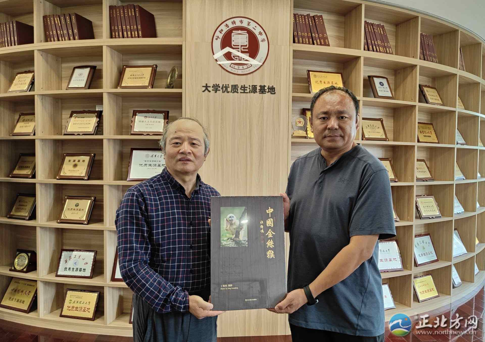 丁寬亮(左)將《中國金絲猴》捐贈呼和浩特市第二中學