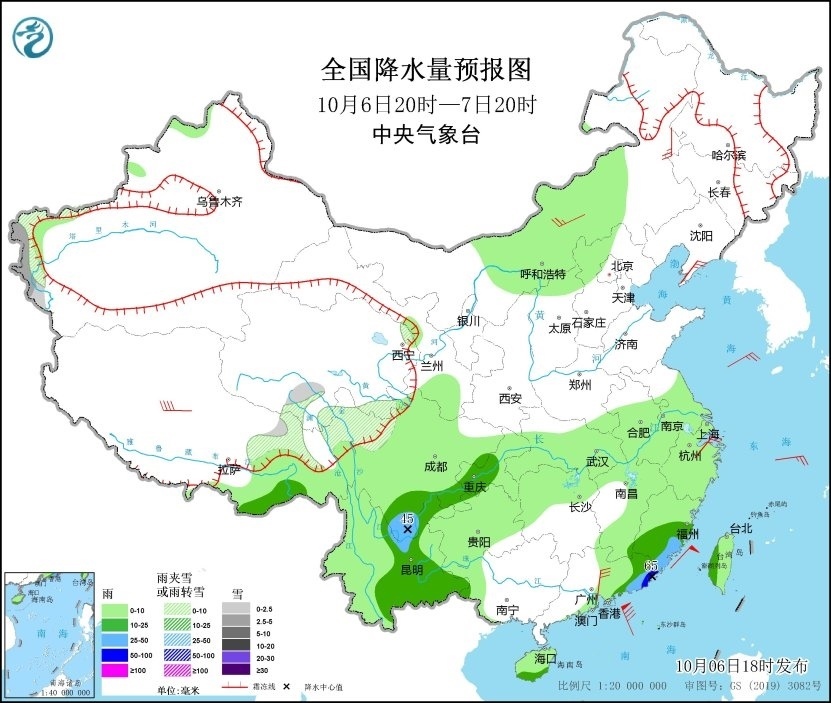 全國降水量預(yù)報圖(10月7日08時-8日08時)