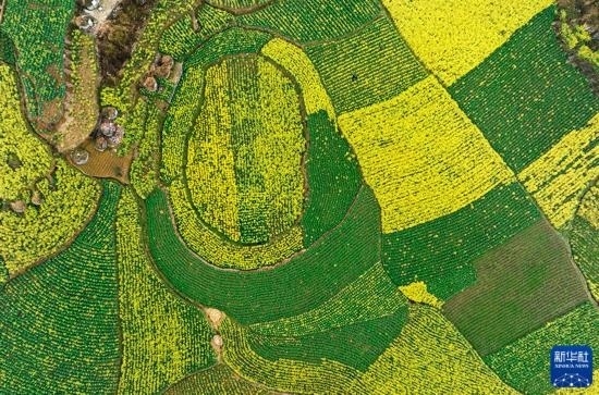 2月17日拍攝的貴州省六盤(pán)水市六枝特區(qū)木崗鎮(zhèn)萬(wàn)畝油菜基地(無(wú)人機(jī)照片)。