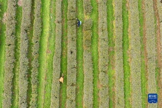 2月17日,茶農(nóng)在湖北省丹江口市土關(guān)埡村武當(dāng)茶谷勞作(無人機照片)。