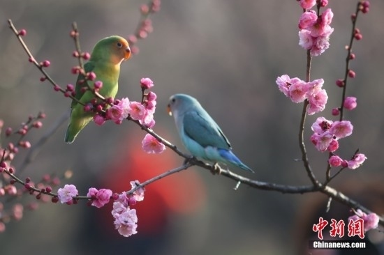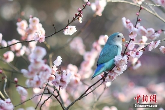 2月20日,江蘇南京,牡丹鸚鵡在梅花山梅花樹上“賞”梅。牡丹鸚鵡由南京一市民飼養(yǎng),每年在梅花盛開的時候,他都會帶著鸚鵡來到這里“賞”梅,同時也成為一景。中新社記者 泱波 攝