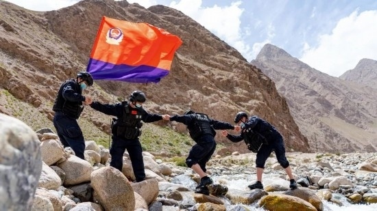 圖為陳暢(左二)和戰(zhàn)友涉水而過、踏邊巡查。