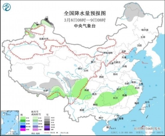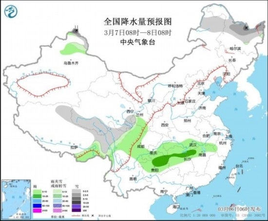 中新網(wǎng)3月6日電 據(jù)中央氣象臺網(wǎng)站消息,未來三天,四川南部和東部、貴州大部、重慶、云南東部、湖南中北部、湖北南部等地有小到中雨,局地大雨。受弱冷空氣影響,新疆西北部的部分地區(qū)有中到大雪或雨夾雪,局地有暴雪。內(nèi)蒙古東北部、黑龍江北部的部分地區(qū)有小到中雪或雨夾雪,局地有大雪。全國其余大部地區(qū)天氣晴好,氣溫逐漸上升。