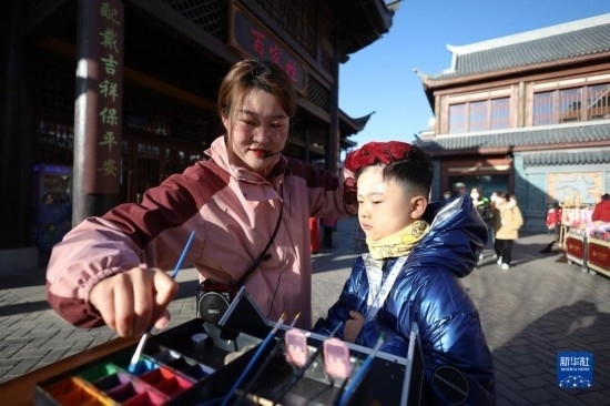 3月3日,在嘉峪關(guān)方特絲路神畫景區(qū),小朋友體驗園區(qū)面部彩繪項目。