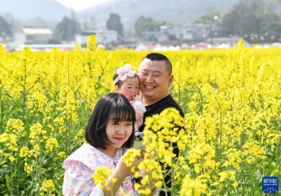 近日,位于四川成都崇州市的數(shù)萬畝油菜花競相綻放,吸引游客前來踏春觀光。