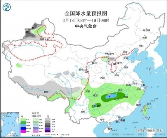 全國(guó)降水量預(yù)報(bào)圖(3月17日08時(shí)-18日08時(shí))