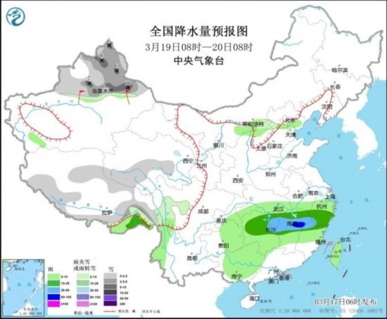 3月19日08時(shí)至20日08時(shí),新疆北疆大部和沿天山地區(qū)、西藏北部和南部、青海南部等地部分地區(qū)有小到中雪或雨夾雪,其中,新疆沿天山地區(qū)和東部等地部分地區(qū)有大到暴雪(10~11毫米)。西藏東南部、湖南中北部、江西中北部、浙江南部、福建北部等地部分地區(qū)有中到大雨,其中,江西中部、福建西北部等地局地有暴雨。新疆南疆盆地和東部等地部分地區(qū)有7~9級(jí)風(fēng)。