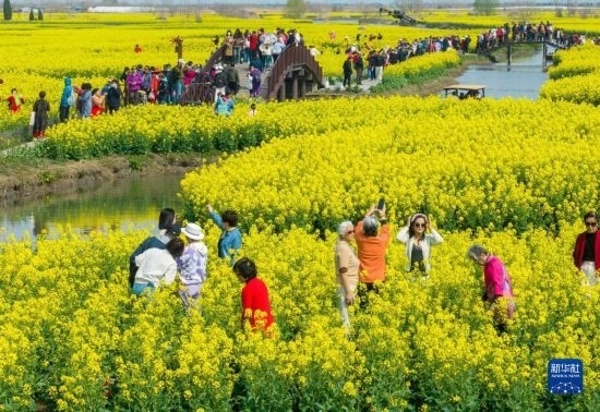 近日,江蘇興化千垛菜花風(fēng)景區(qū)溝河交錯(cuò)圍成的垛田上,油菜花次第開放,吸引人們前來(lái)踏青賞花。