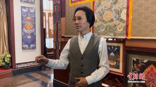 非遺傳承人拉孟長(zhǎng)期致力于免費(fèi)培養(yǎng)唐卡傳承人。圖為拉孟介紹唐卡文化。中新網(wǎng)記者 劉湃 攝