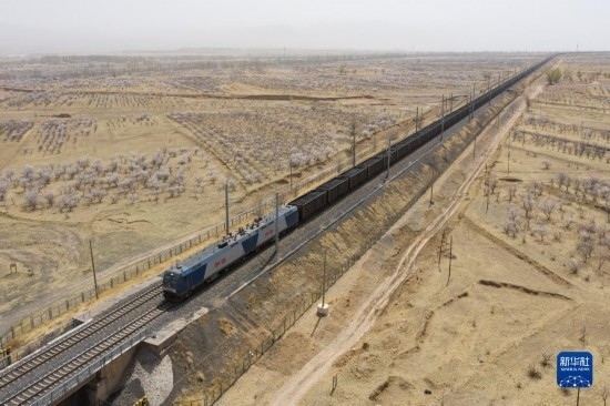 重載列車(chē)行駛在大秦鐵路上(4月11日攝,無(wú)人機(jī)照片)。