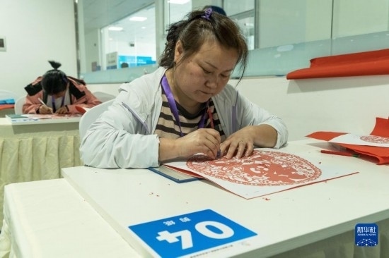 4月12日,在四川省綿陽(yáng)市公共實(shí)訓(xùn)基地,參加剪紙項(xiàng)目的選手正在比賽中。