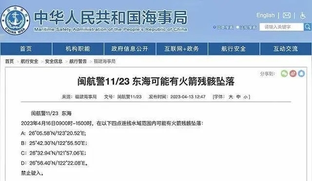 ·福建海事局發(fā)布航行警告:東海部分水域可能有火箭殘骸墜落。
