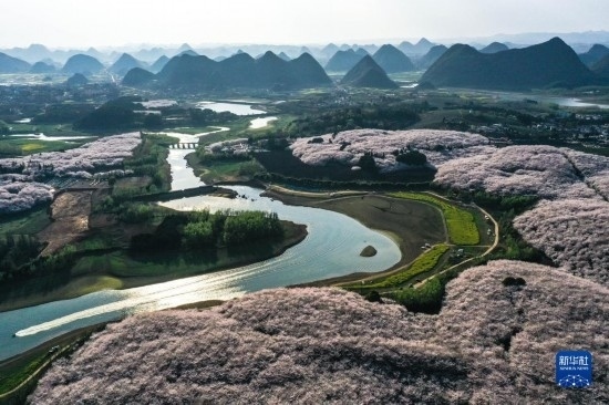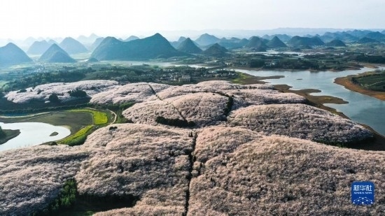 貴州省貴安新區(qū)櫻花園風(fēng)貌(3月21日攝,無人機(jī)照片)。