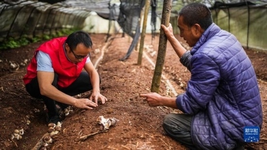 4月14日,農(nóng)技工作者在六盤水市鐘山區(qū)汪家寨鎮(zhèn)那羅村查看皺環(huán)球蓋菇的種植情況。