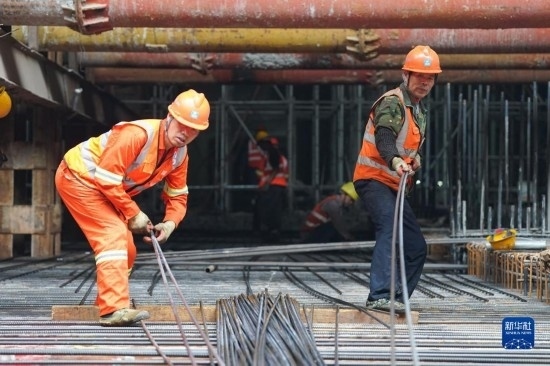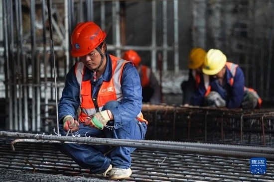 5月3日,中建八局的工人在合肥地鐵7號線蓮花路站工程現(xiàn)場施工。