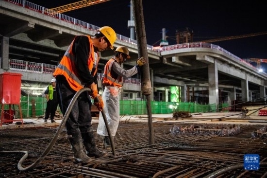 5月3日,在長沙西站建設(shè)工地,工人進行混凝土澆筑作業(yè)。