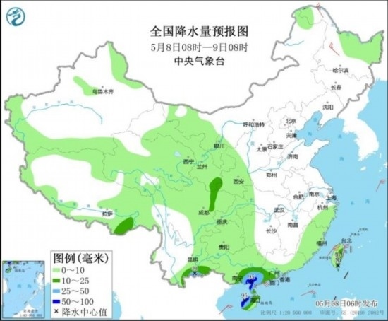 全國降水量預(yù)報(bào)圖(5月8日08時(shí)-9日08時(shí))