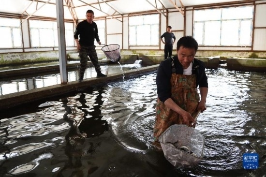 5月7日,養(yǎng)殖基地負(fù)責(zé)人耿海濤(前)在育苗區(qū)打撈細(xì)鱗鮭魚苗。