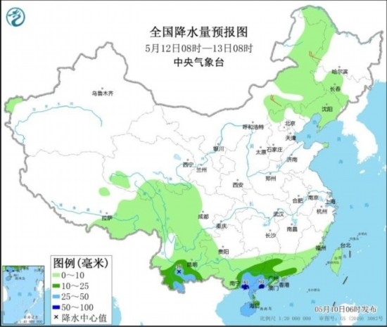 5月10日08時至11日08時,甘肅東部、青海東部和南部、西藏東部等地的部分地區(qū)有中到大雪或雨夾雪,其中,青海東南部等地局地有暴雪;西藏東南部、江南南部和西部、貴州南部、廣西大部、廣東北部和西南沿海、海南島等地部分地區(qū)有中到大雨,其中,廣西中北部等地局地有暴雨(50~70毫米)。內(nèi)蒙古中部、甘肅河西、遼寧中北部、浙江北部等地部分地區(qū)有4~6級風(fēng),其中,西藏南部部分地區(qū)有6~7級風(fēng)。臺灣海峽、南海北部海域?qū)⒂?~7級、陣風(fēng)8級的東北或偏東風(fēng)。