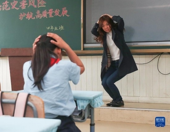 5月12日,沈陽市北塔小學的老師為學生演示應急避險動作。