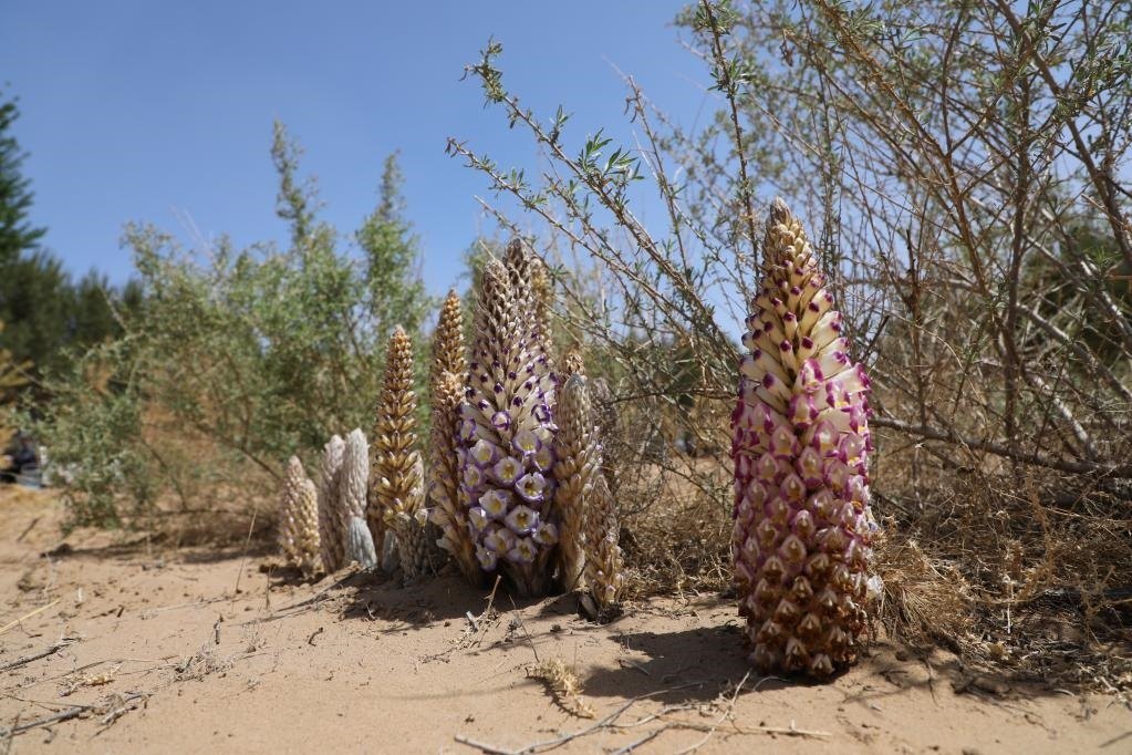 記者在四翅濱藜肉蓯蓉試種基地看到,一株株四翅濱藜綠意盈盈,在其根部生長的一排排肉蓯蓉破土而出,一株最多長出40多株肉蓯蓉,五顏六色的肉蓯蓉花競相開放,成為一道美麗的風景。