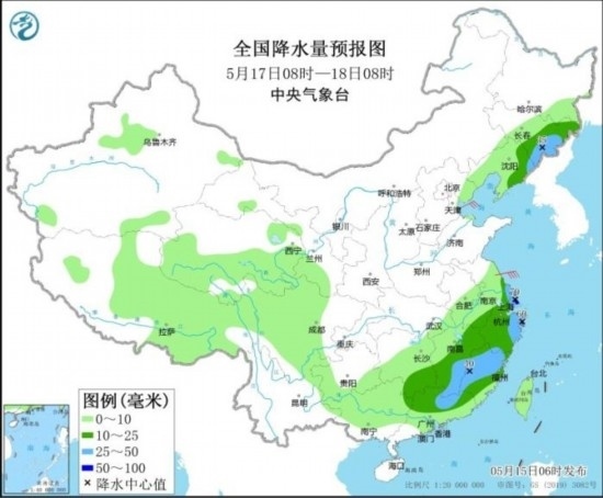 5月17日08時(shí)至18日08時(shí),東北地區(qū)東部、江南大部、華南北部等地部分地區(qū)有中到大雨,其中,江蘇東南部、上海、浙江東北部等地部分地區(qū)有暴雨(50~70毫米)。