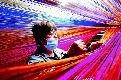 在山東惠民縣辛店鎮(zhèn)“惠民工坊”,一名女員工在接紡線。新華社發(fā)