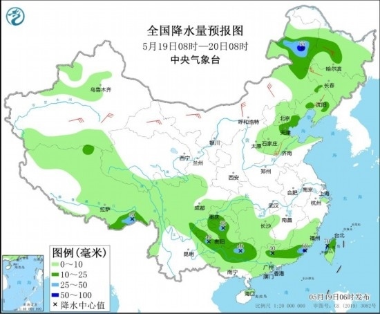 5月19日08時至20日08時,內(nèi)蒙古東部、東北地區(qū)、華北中東部、新疆北部、西藏、西南地區(qū)東部和北部、江南西部和南部、華南大部等地部分地區(qū)有小到中雨,局地有大雨或暴雨(50~70毫米),上述部分地區(qū)伴有短時強降水,局地有雷暴大風(fēng)或冰雹等強對流天氣。內(nèi)蒙古、東北地區(qū)、西北地區(qū)東部等地部分地區(qū)有4~6級風(fēng)。
