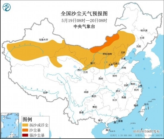 全國沙塵天氣預(yù)報圖(5月19日08時-20日08時)。圖片來源:中央氣象臺網(wǎng)站