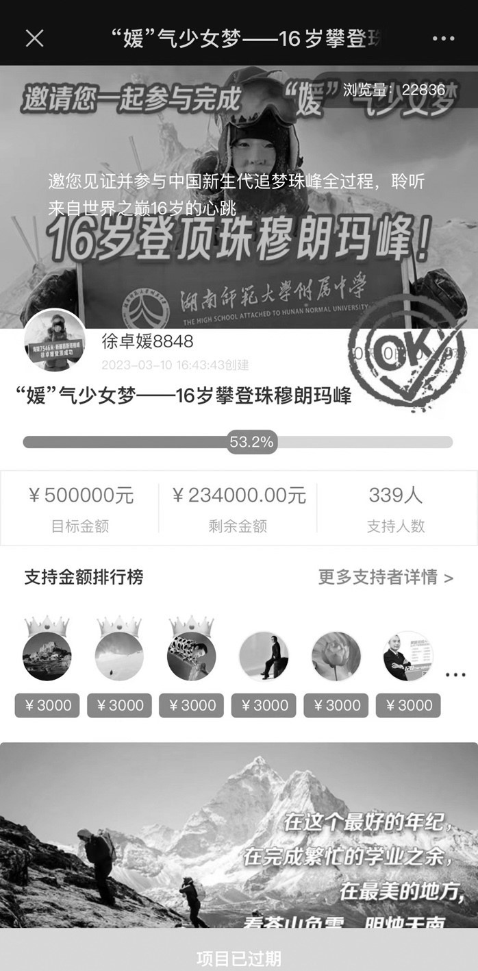 5月15日,揚(yáng)子晚報紫牛新聞記者再次點(diǎn)開徐卓媛當(dāng)初發(fā)起助力登峰的眾籌鏈接,發(fā)現(xiàn)該項(xiàng)目已過期,籌款進(jìn)度最終定格在53.2%,最終籌集到資金266000元。除去徐江雷朋友們贊助的這二十多萬元,據(jù)了解,還有一些企業(yè)也出資贊助了徐卓媛登頂珠峰的活動。徐江雷此前告訴記者,江蘇一家藥企看到此前揚(yáng)子晚報對于徐卓媛的報道后(本報今年3月17日刊登《眾籌50萬,助16歲女兒挑戰(zhàn)珠峰》一文),被她小小年紀(jì)敢于攀登高峰的精神所打動,秉承著“少年強(qiáng)則國強(qiáng)”的理念,慷慨贊助徐卓媛登山資金30萬元。
