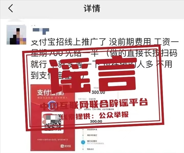 真相:近日,有網(wǎng)民向支付寶開(kāi)放平臺(tái)反饋,看到有打著“螞蟻推廣”或“支付寶推廣”等旗號(hào),聲稱(chēng)“出租朋友圈可以賺取100/天”的推廣任務(wù)。對(duì)此,支付寶辟謠稱(chēng),此類(lèi)活動(dòng)均為詐騙,請(qǐng)勿輕信。