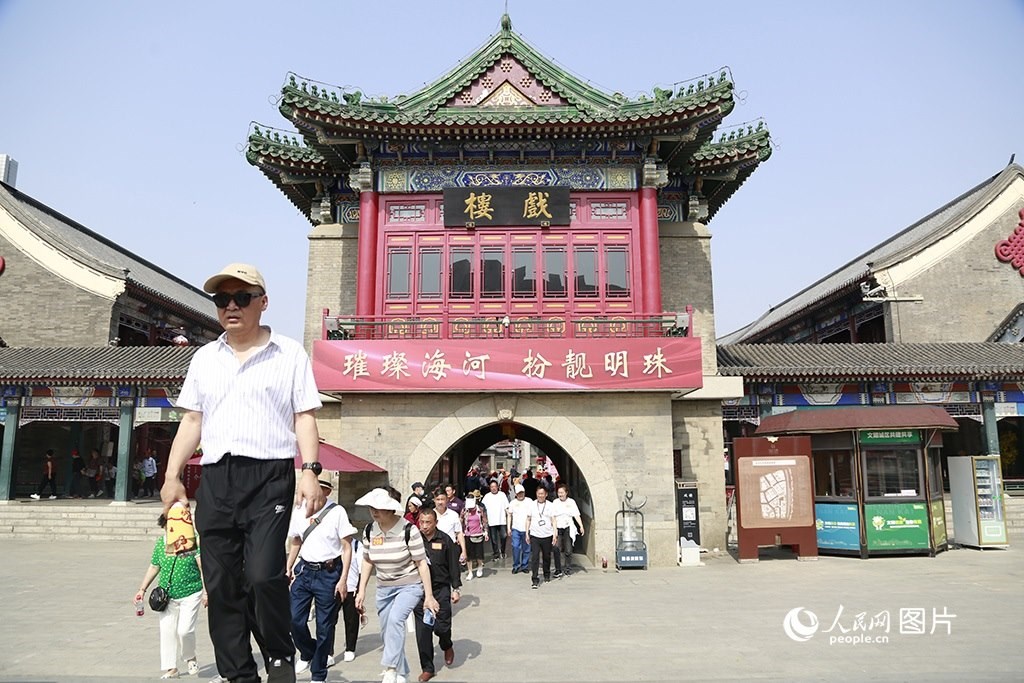 天津古文化街位于海河西岸,是國家5A級(jí)旅游景區(qū)、津門十景之一。5月16日,旅客從古文化街的戲樓走出。人民網(wǎng) 崔新耀攝