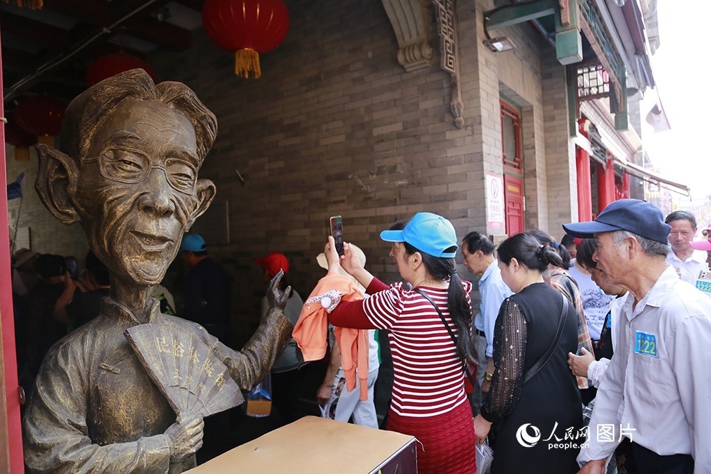 天津古文化街位于海河西岸,是國家5A級(jí)旅游景區(qū)、津門十景之一。5月16日,游客從相聲大師馬三立的雕塑旁走過。人民網(wǎng) 崔新耀攝