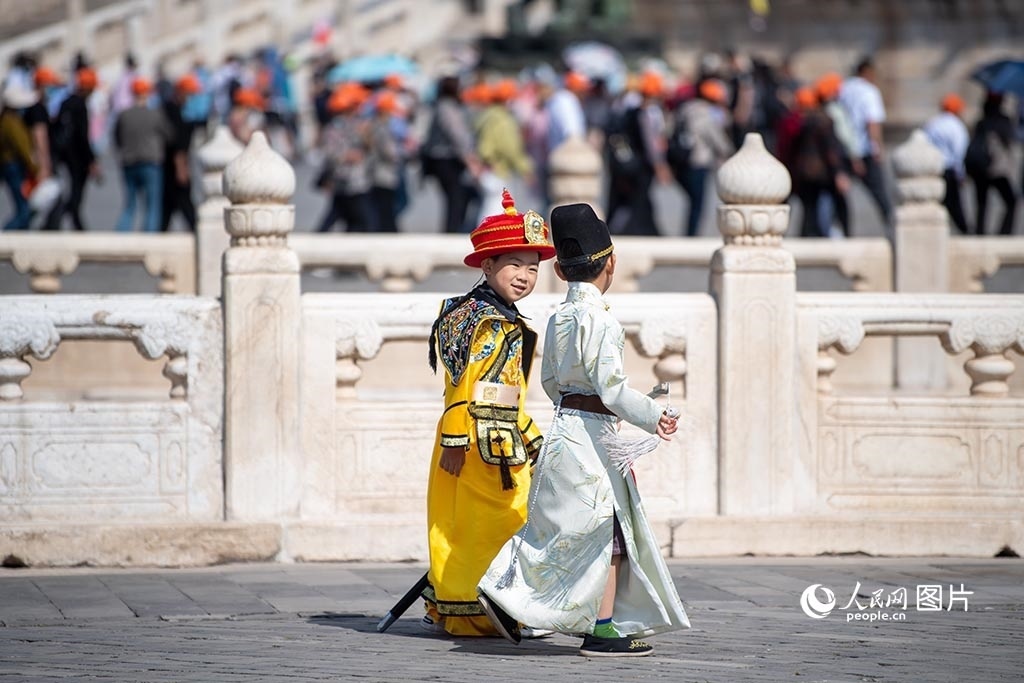 5月18日,兩位身著古裝的小孩正在故宮游覽。人民網(wǎng)記者 翁奇羽攝