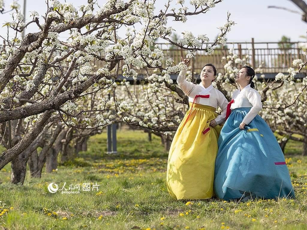 5月11日,吉林省延邊州龍井市萬畝梨園迎來梨花盛開期。走在梨樹下,游客們載歌載舞,彈琴賞花,拍照留念。人民網(wǎng) 李洋攝