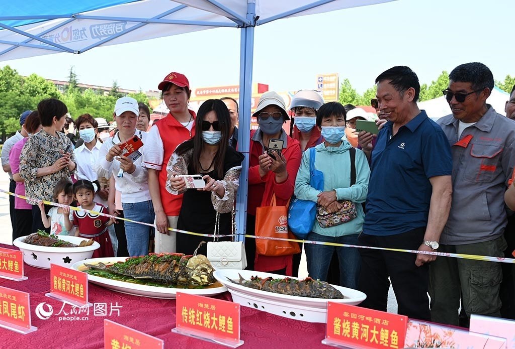 5月17日,“中國旅游日”主題周活動(dòng)期間,河南省義馬市舉辦“櫻紅五月”美食節(jié),集中展示當(dāng)?shù)氐奶厣朗场⒚麅?yōu)特產(chǎn),為了讓游客有更好的體驗(yàn),當(dāng)?shù)?2家飯店還進(jìn)行了精彩紛呈的廚藝大比拼。活動(dòng)現(xiàn)場(chǎng),游客在圍觀經(jīng)典豫菜“紅燒黃河大鯉魚”。人民網(wǎng)記者 王玉興攝