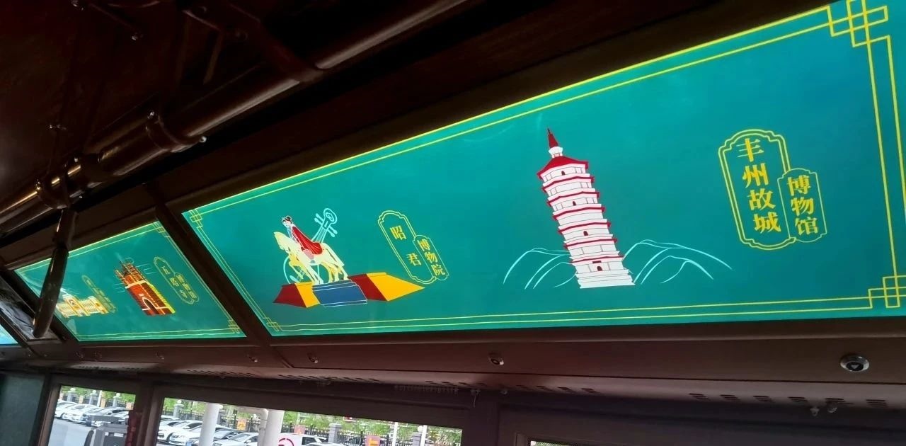 除了復(fù)古風(fēng)的車身外型,主題車廂內(nèi)也充滿了如詩(shī)如畫的文旅元素,為乘客們顯示了五塔寺、昭君博物院、豐州故城博物館等本土旅游勝地,乘坐鐺鐺車,乘客在瀏覽美麗街景的同時(shí),也可通過(guò)車內(nèi)看板了解到青城的名勝古跡。