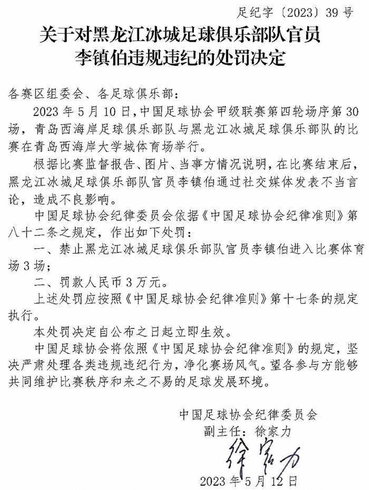 中國足協(xié)紀(jì)律委員會根據(jù)裁判員報告、比賽監(jiān)督報告、視頻、當(dāng)事方情況說明及聽證,認(rèn)定楊帆實施暴力行為,于是依據(jù)《中國足球協(xié)會紀(jì)律準(zhǔn)則》第五十三條、第四十八條之規(guī)定,對他給予停賽4場、罰款人民幣4萬元的處罰。在這張罰單上,第一次出現(xiàn)了徐家力的名字。從這張罰單來看,中國足協(xié)紀(jì)律委員會定下了基調(diào),那就是嚴(yán)厲打擊球場暴力行為。