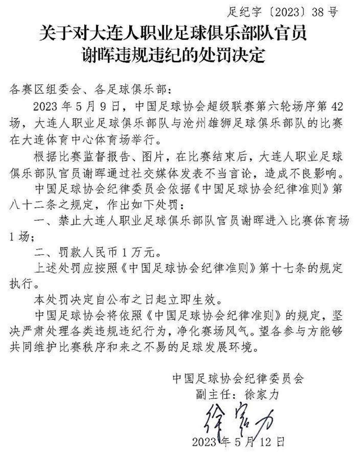 5月12日,中國足協(xié)紀(jì)律委員會接連開出三張罰單,對中超大連人隊的主教練謝暉,以及南通支云隊、黑龍江冰城隊的兩位俱樂部官員范兵和李鎮(zhèn)伯進(jìn)行了處罰,共計罰款5萬元,并對三人追加禁賽。這三張罰單一出,引來外界的一片質(zhì)疑聲。