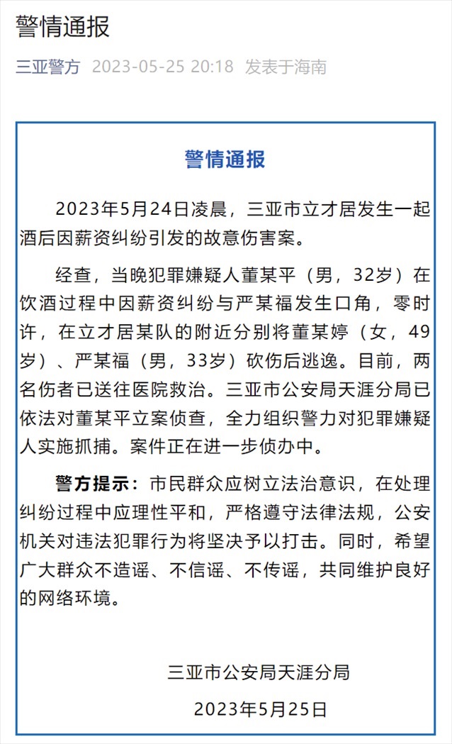 此前,三亞市公安局天涯分局通報(bào)稱:5月24日凌晨,三亞市立才居發(fā)生一起酒后因薪資糾紛引發(fā)的故意傷害案。犯罪嫌疑人董某平(男,32歲)在飲酒過程中因薪資糾紛與嚴(yán)某福發(fā)生口角,零時(shí)許,在立才居某隊(duì)的附近分別將董某婷(女,49歲)、嚴(yán)某福(男,33歲)砍傷后逃逸。