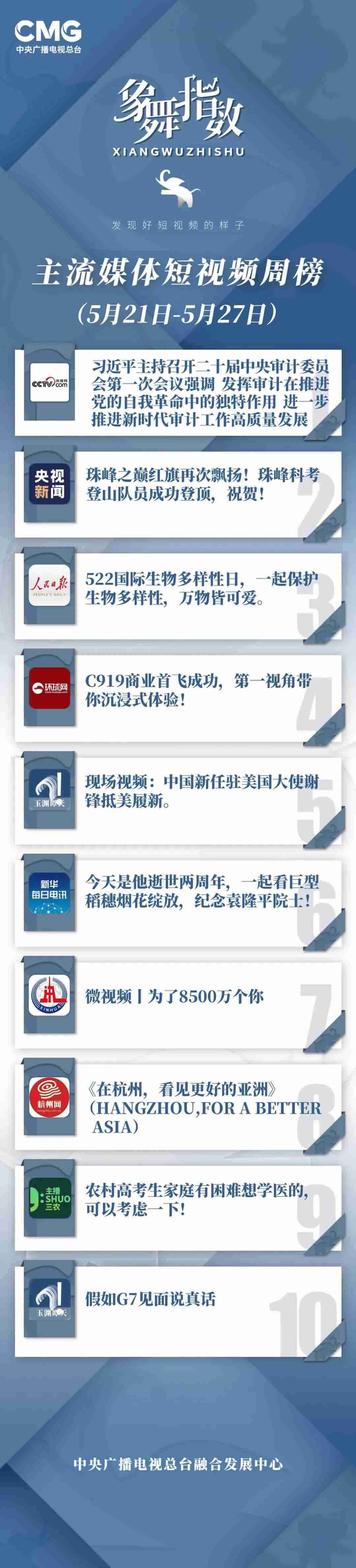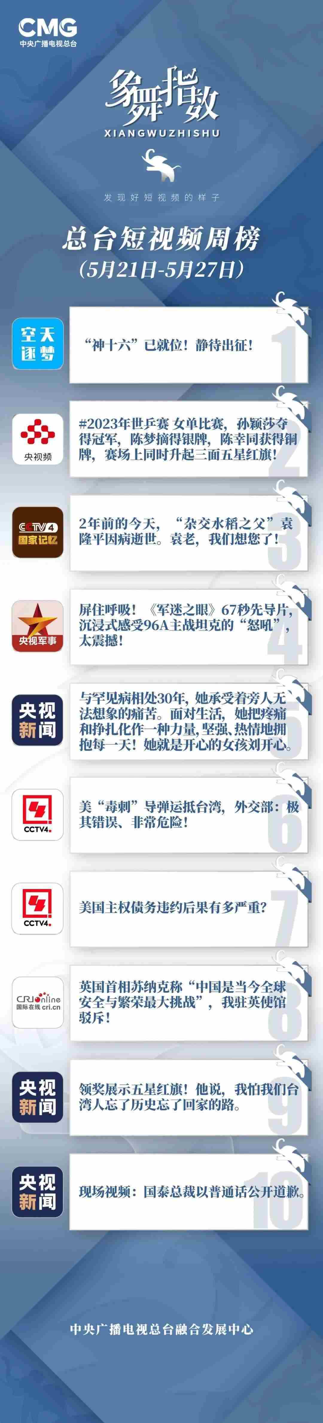 中央廣播電視總臺“象舞指數(shù)”評議品牌,推出主流媒體短視頻周榜、總臺短視頻周榜。在2023年5月21日—5月27日,這些內(nèi)容引發(fā)大眾關注: