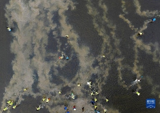 5月30日,在淮安市洪澤區(qū)岔河鎮(zhèn),人們?cè)诓逖砉?jié)上參加摸魚比賽(無(wú)人機(jī)照片)。